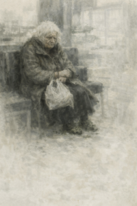 Vanha nainen – sellainen, jonka yli elämän rekka näyttää ajaneen – istui kaupan aulassa kuin olisi istunut siinä tuhat ja yksi yötä. Kohta sammal kasvaisi kengän päälle.