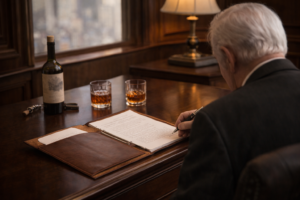 Hän otti ensin pari lasia ja pullon viskiä pöydälle ikkunan likelle ja sitten haki siihen kirjoituspöydältään kansion ja kynän, jossa oli hopeaan upotettu monogrammi. AT – hänen isänsä nimikirjaimet.